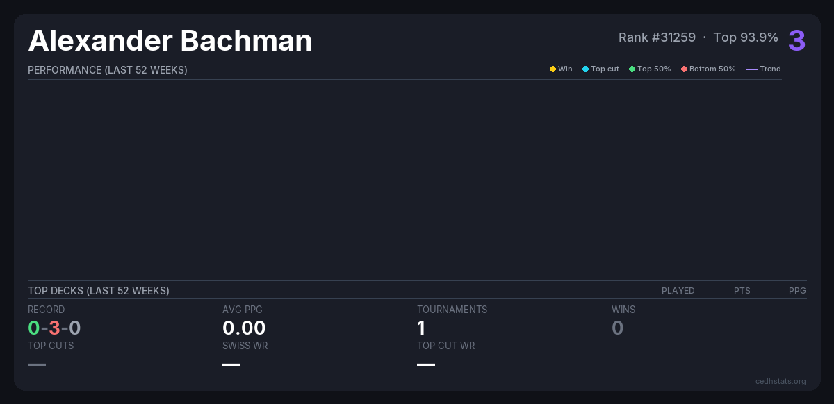 | Bracket 3 Mar 29, 2026 · 22 players | 21/22 | 0-3-0 | 0.00 | 3 |