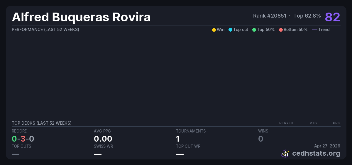 | BATALLA DE PRECON ( ESPECIAL STRIXHAVEN ) Apr 26, 2026 · 19 players | — | 7/19 | 0-3-0 | 0.00 | 82 |