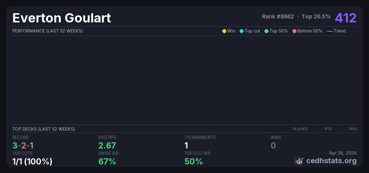 | Tournament | Deck | Result | Record | PPG | Points ? |