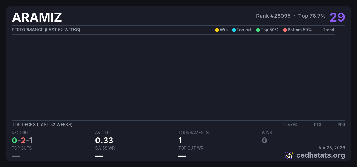 | CYDH Oct 02, 2025 · 20 players | Invalid pairing | 14/20 | 0-2-1 | 0.33 | 29 |