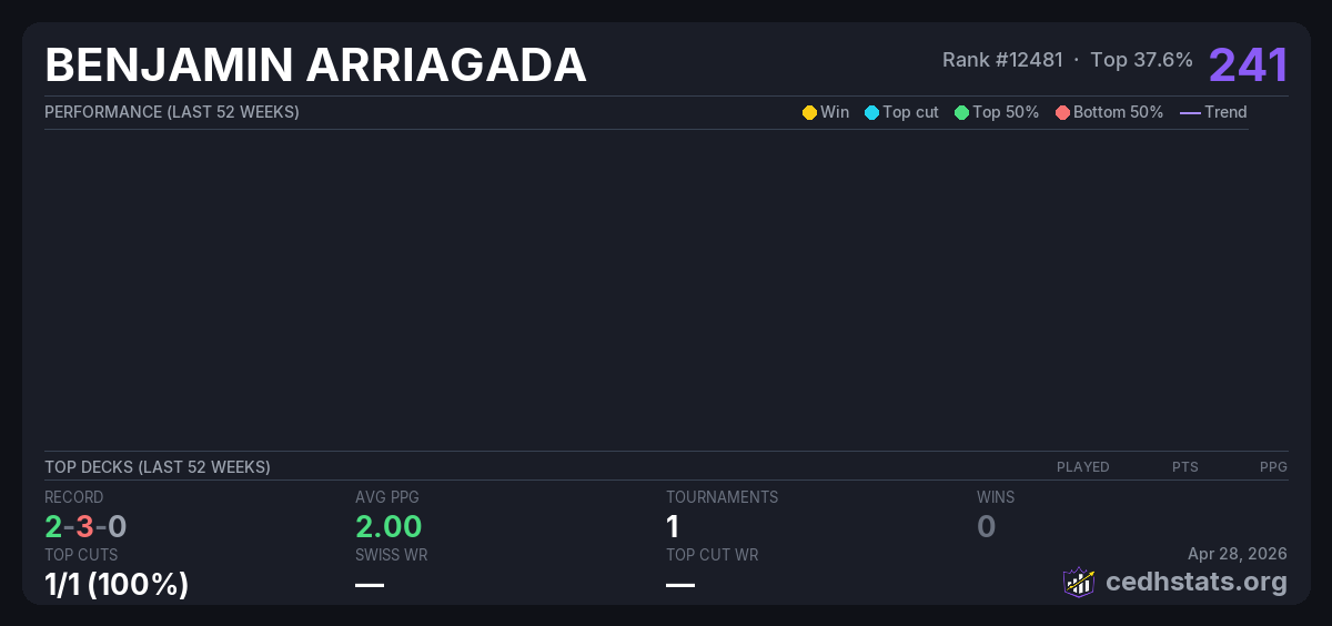 | CEDH PACTO HAMMER Oct 04, 2025 · 20 players | Invalid pairing | 3/20 | 2-3-0 | 2.00 | 241 |