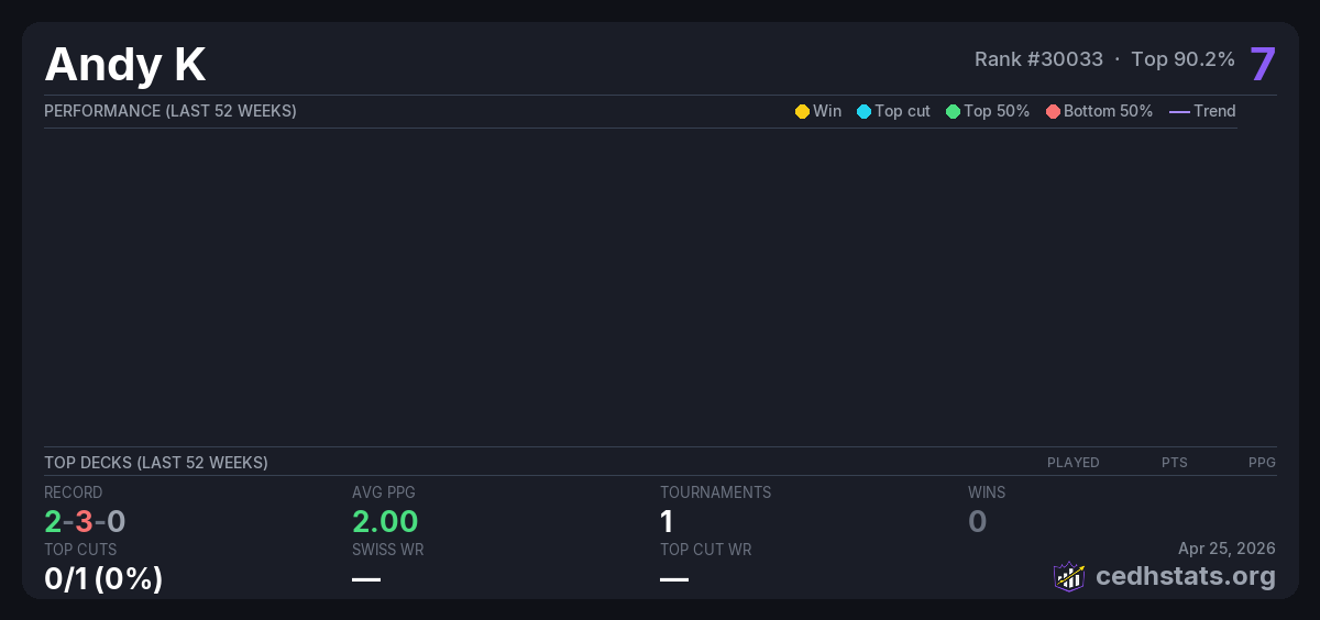 | $200 CEDH Win a Mox Aug 23, 2025 · 25 players | Invalid pairing | 22/25 | 2-3-0 | 2.00 | 7 |