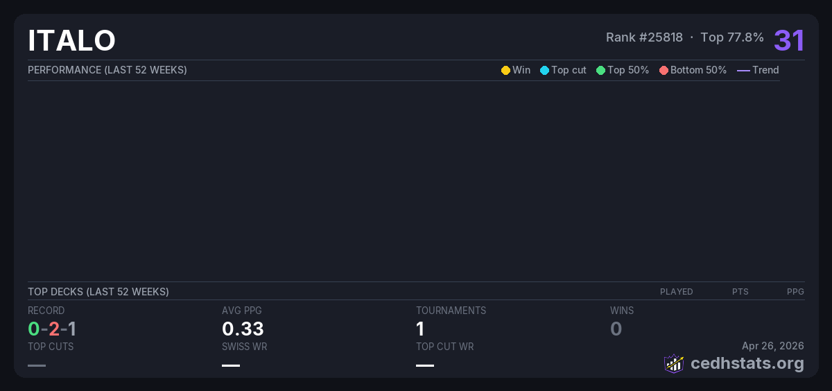 | P.A.R.A Oct 14, 2025 · 16 players | Invalid pairing | 11/16 | 0-2-1 | 0.33 | 31 |