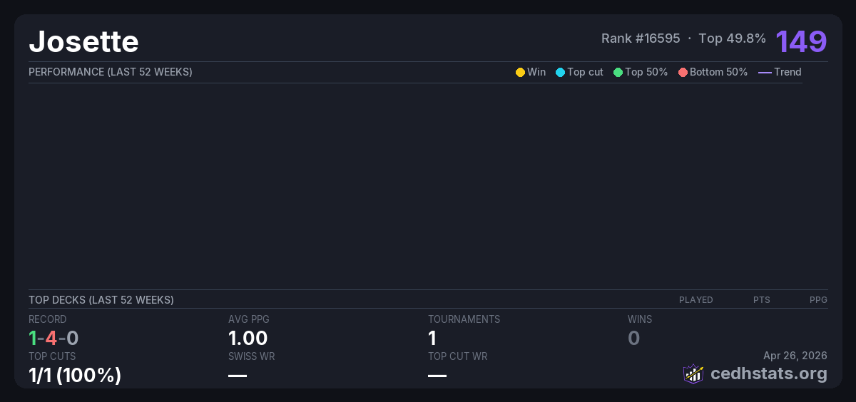 | Unaltered Precon Feb 08, 2026 · 19 players | 7/19 | 1-4-0 | 1.00 | 149 |