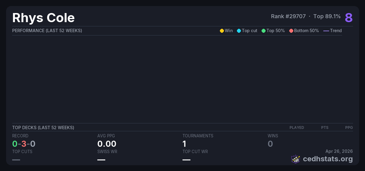 | Commander Wednesday Weekly Jun 11, 2025 · 23 players | Invalid pairing | 20/23 | 0-3-0 | 0.00 | 8 |