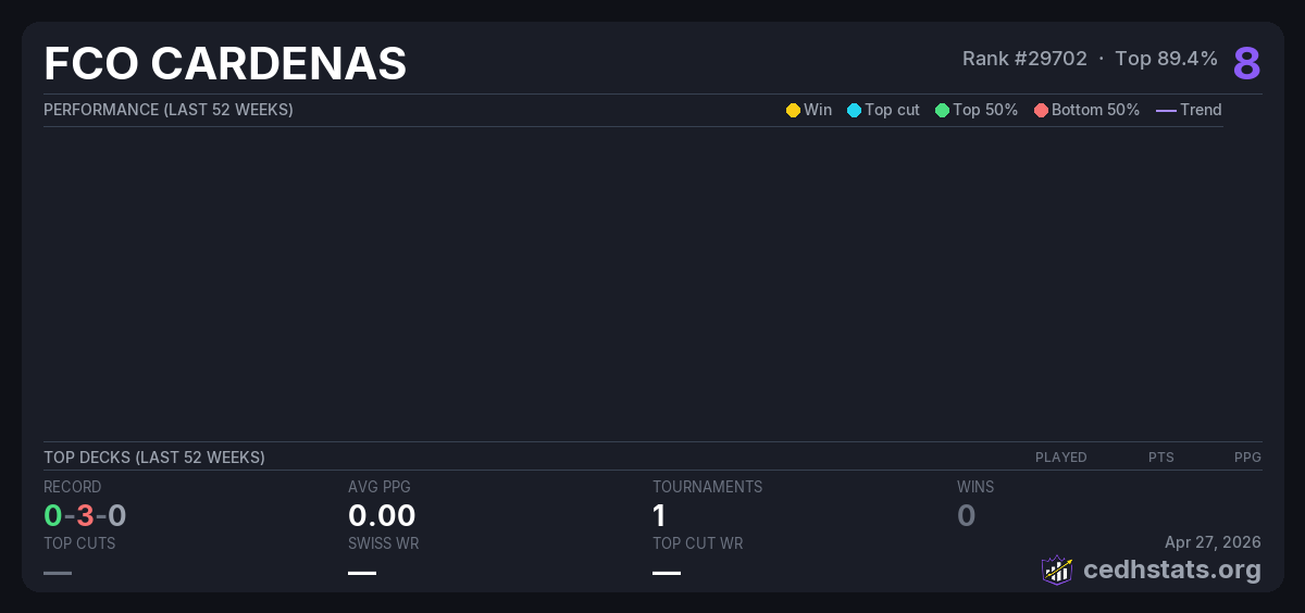 | CEDH PARA COMENZAR BIEN LA SEMANA Jun 09, 2025 · 16 players | Invalid pairing | 14/16 | 0-3-0 | 0.00 | 8 |