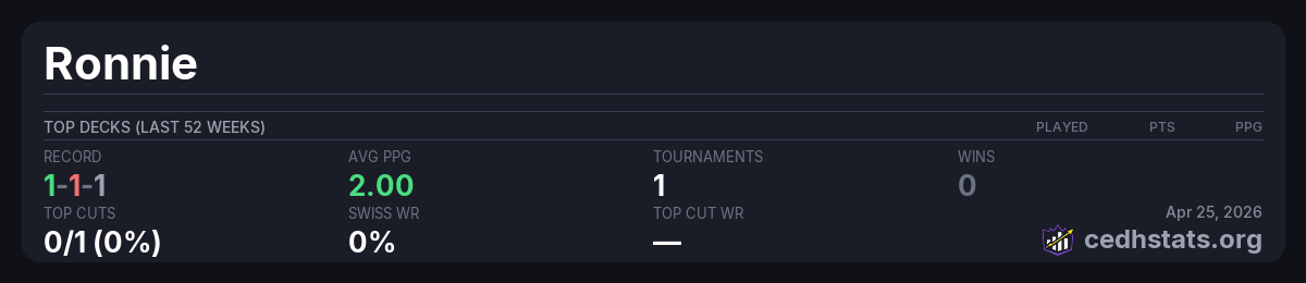 | Tournament | Deck | Result | Record | PPG | Points ? |