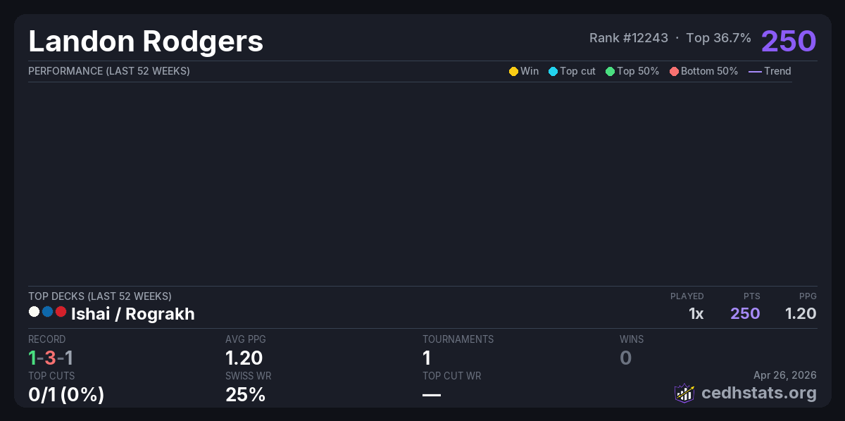 | Shuffle N Roll's cEDH Dual Land Tournament Apr 25, 2026 · 52 players | Ishai / Rograkh | 20/52 | 1-3-1 | 1.20 | 250 |