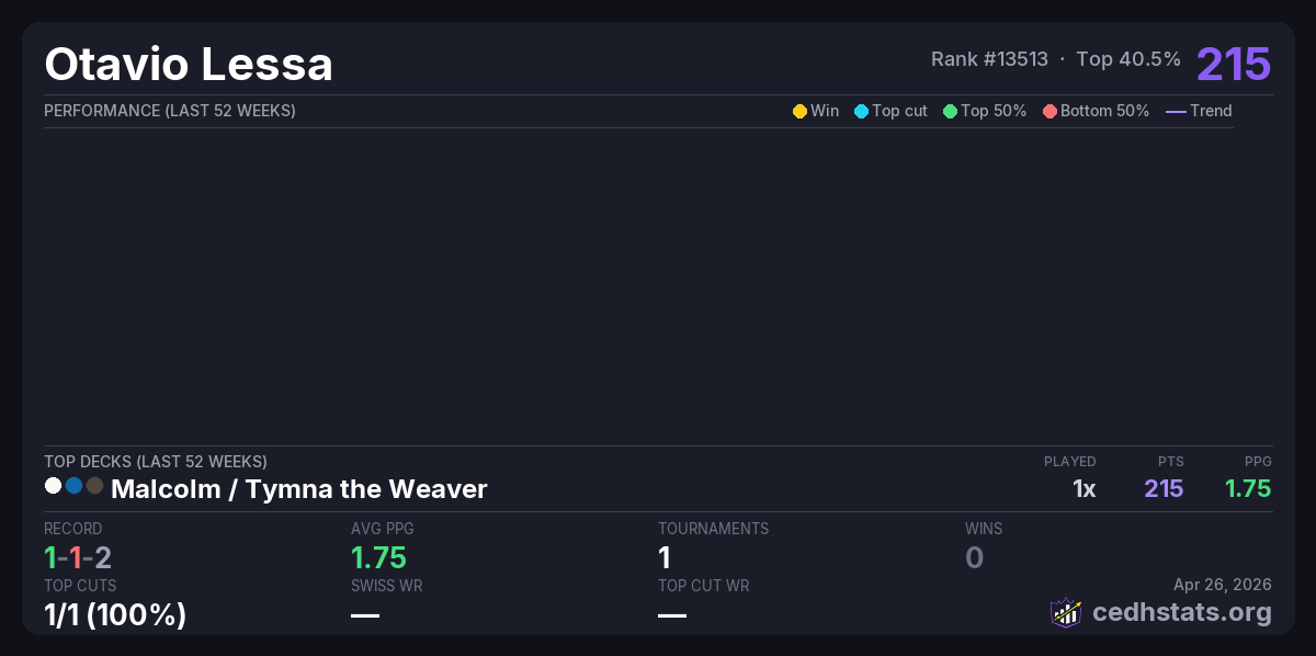 | Big Duck is back in town 2k Jun 15, 2025 | Malcolm / Tymna | 7/28 | 1-1-2 | 215 |